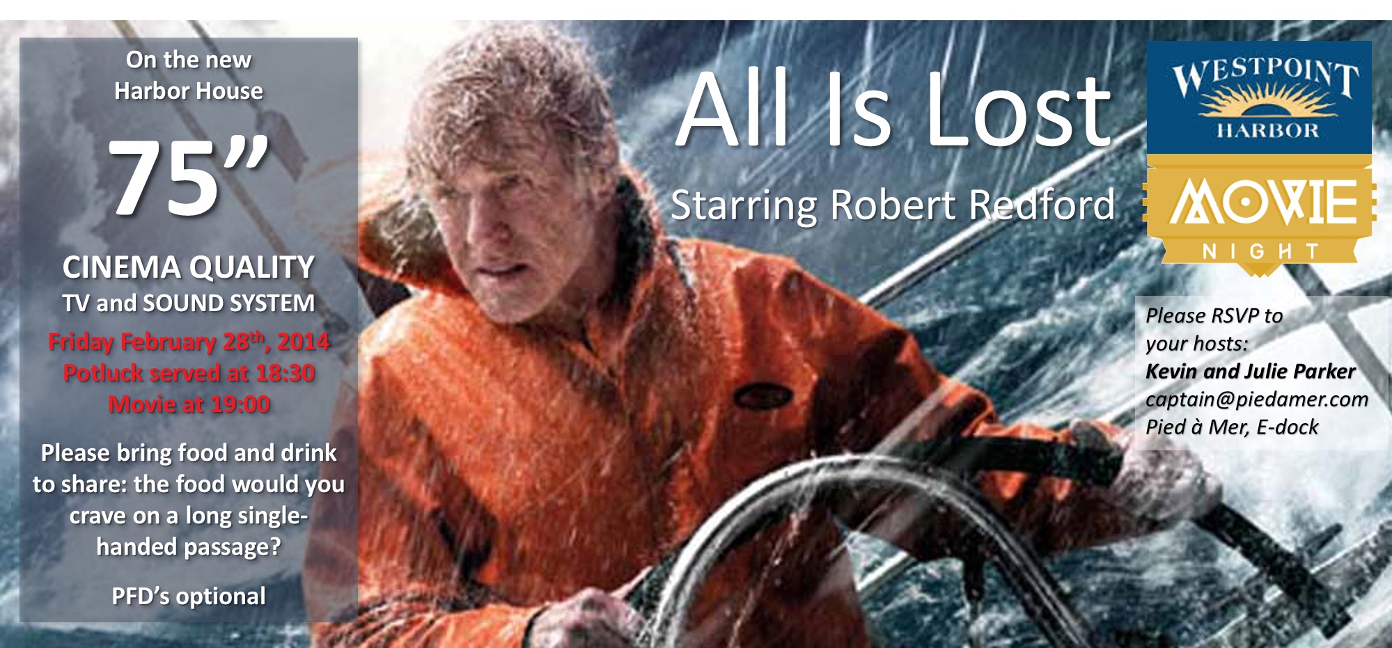Westpoint Harbor Movie Night – All Is Lost starring Robert Redford – Friday February 28th at 18:30